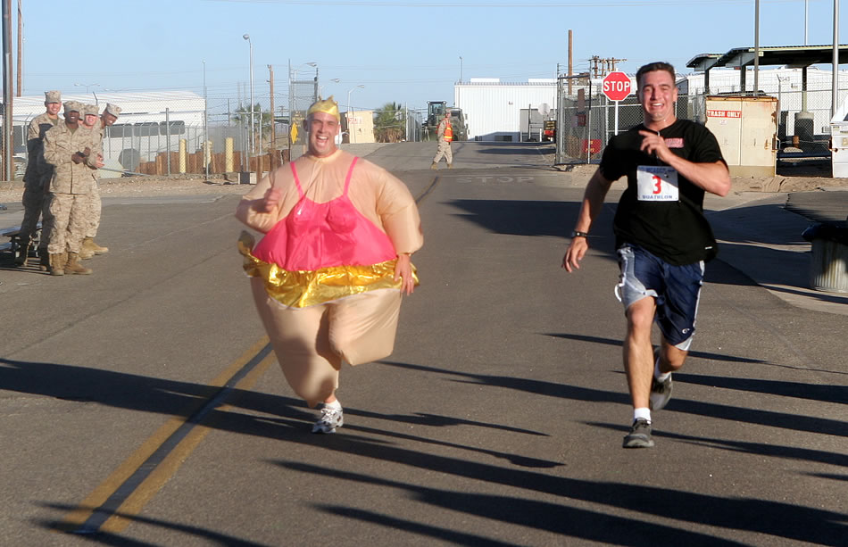 Chad Craven and Raymond Attaway sprint for third place of the 4th Marine Corps Communication-Electronics School Fun Run 10 kilometer race in front of Combat Center building 1831 Oct. 19. Photo by: Pfc. Jared J. Butler